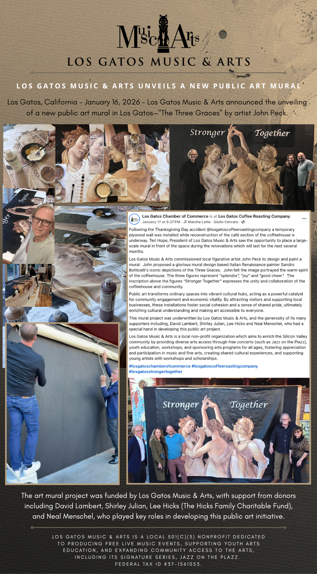 Los Gatos, California – January 16, 2026 – Los Gatos Music & Arts announced the unveiling of a new public art mural in Los Gatos—”The Three Graces” by artist John Peck.